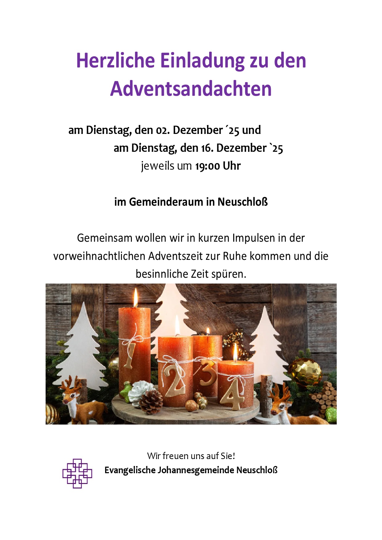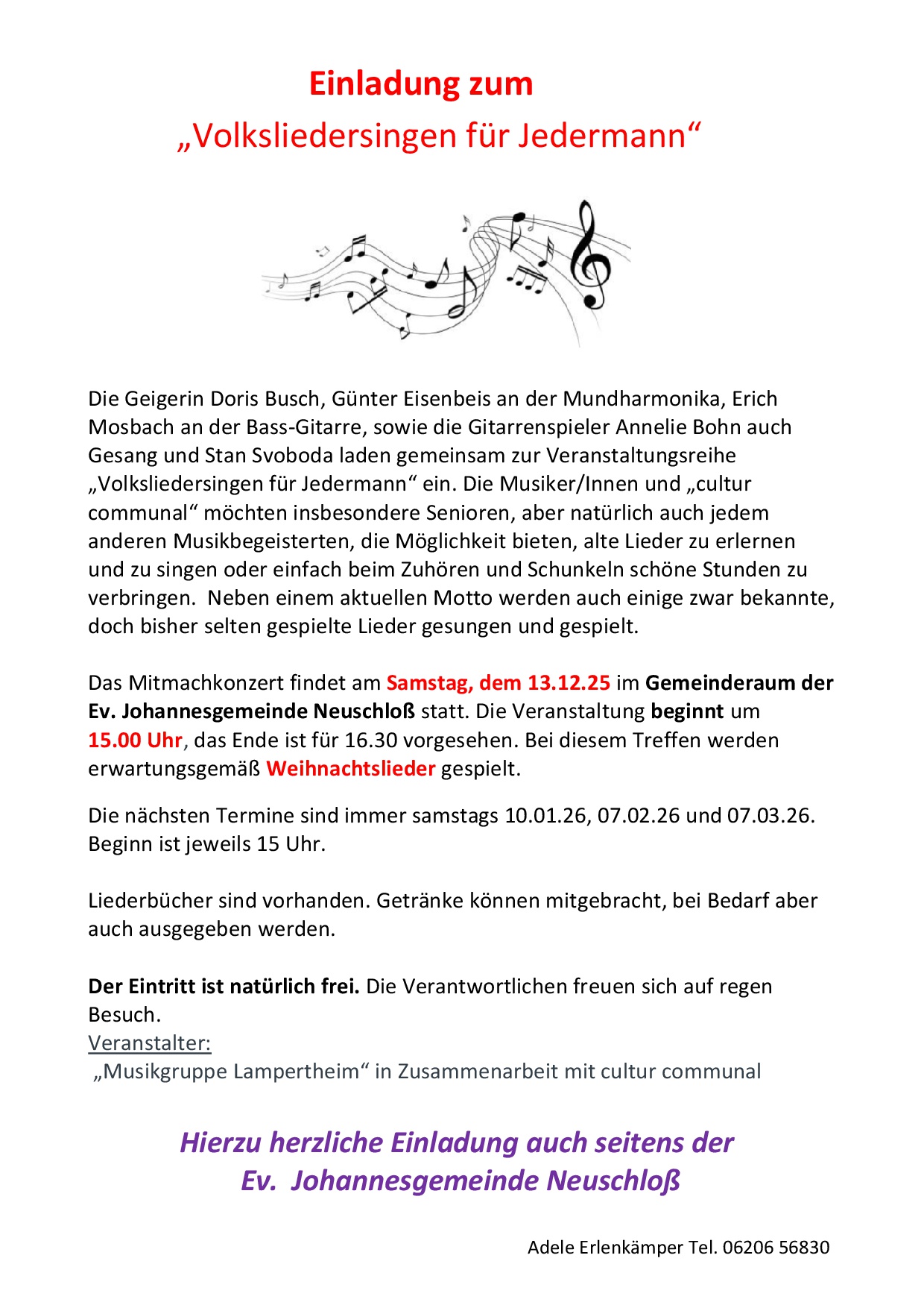 „Es ist schade, dass die altbekannten Advents- und Weihnachtslieder immer nur in einer so kurzen Zeit gesungen werden“, dachten sich Ruth Rupp und einige Gemeindemitglieder aus Neuschloß. Ganz nach dem Motto: „Laßt uns froh und munter sein und uns recht von Herzen freun….. „ machen wir uns einen gemütlichen Nachmittag, singen die schönen Lieder, erzählen uns Gedichte und Geschichten und genießen einfach die Zeit. Und dazu laden wir die komplette Gemeinde herzlich ein“.
