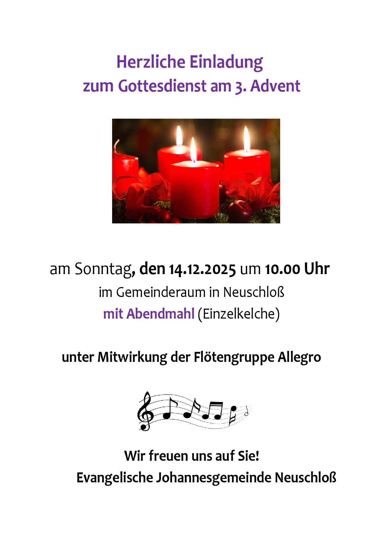 14.12. Sonntag - 3. Advent 10:00 Gottesdienst mit Abendmahl & Flötengruppe Allegro Näheres